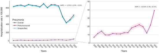 The overall pneumonia-related hospitalization rate in individuals over 65 decreased during the investigated period (AAPC −1.931). However, the trend is stable when only the pre-pandemic years are considered, while a decline can be observed starting from 2020 (AAPC −19.697), followed by an increase in 2023 (APC 15.001). The observed increase in hospitalization rate has not reached the pre-pandemic levels. Therefore, further studies are necessary to understand the evolution in the coming years. Instead, a significant positive trend was observed for pneumococcal pneumonia (AAPC +6.820), although only 2% of discharge forms reported a specific diagnosis. These findings are consistent with those of a previous Italian study by Amodio et al., which reported an increased risk of hospitalization for specified bacterial pneumonia (AAPC +3.33) in adults (≥18 years) from 2010 to 2019 []. Additionally, the authors noted a significant positive trend at the national level for unspecified pneumonias. A Spanish study also observed an increase in pneumococcal pneumonia cases among both children and the elderly in the years preceding the COVID-19 pandemic [].