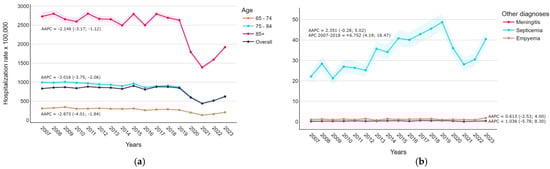 Hospitalization rate (per 100,000 inhabitants) trends with average Annual Percentage Change (AAPC) and 95% confidence intervals: (a) pneumonia-related admissions by age group; (b) other co-diagnosed invasive bacterial diseases.
