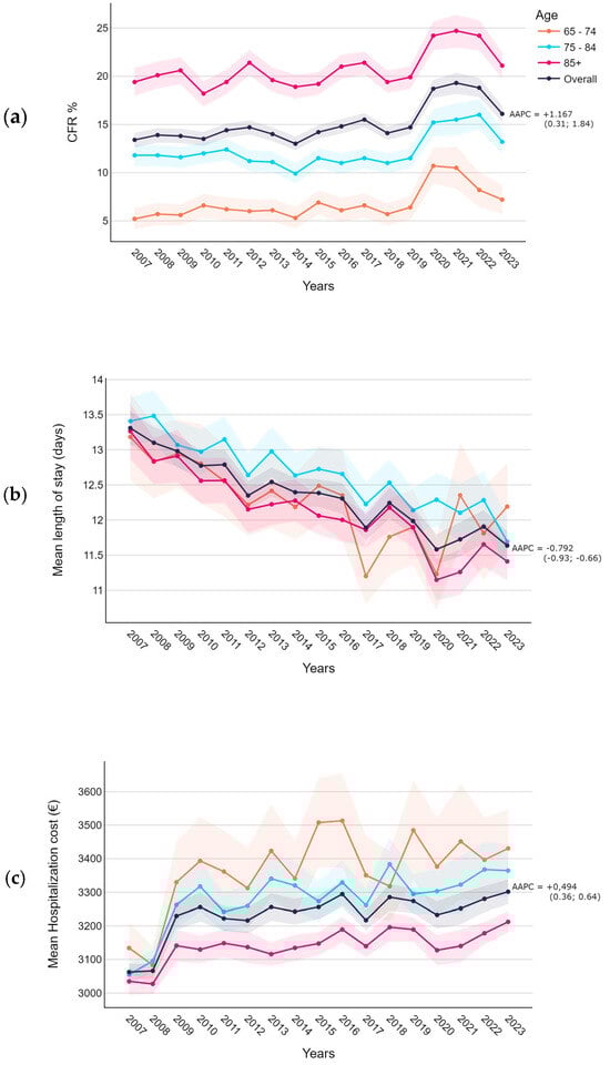 The estimated in-hospital case fatality rate trend showed an overall increase (AAPC 1.167, 95% CI 0.31; 1.84), although it was stationary between 13% and 15.5% before the COVID-19 emergency (Figure 3a), and it was not significant when stratified by age. Similarly, the trend of mean costs showed a significant increase, rising from EUR 3062.5 to more than EUR 3301.5 (Figure 3c). Conversely, the length of stay showed a slight decrease (Figure 3b).
