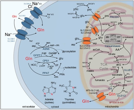 Biochemical pathways and transporters involving glutamine (Gln) and related intermediates. Glutamine is transported by plasma membrane transporters (e.g., SLC1A5/ASCT2, SLC6A14/ATB0,+, SLC38A1/SNAT1, SLC38A2/SNAT2) and fuel nucleotide, amino acid, and glycosyl synthesis via asparagine synthetase (ASNS), carbamoyl phosphate synthetase I (CPS1), phosphoribosyl pyrophosphate amidotransferase (PPAT), and glutamine-fructose 6-phosphate aminotransferase (GFPT1). Sodium (Na+) and chloride (Cl−) gradients across the plasma membrane determine the intracellular concentration of glutamine. Glutamine directly contributes nitrogen for purine and pyrimidine biosynthesis (marked in red). Cytosolic glutamine can also transport into mitochondria via a mitochondrial-targeted (MTS) SLC1A5 variant (MTS-SLC1A5; also referred to as SLC1A5_var) where it acts as a major anaplerotic source for tricarboxylic acid (TCA) cycle metabolism (‘glutaminolysis’). Glutaminolysis is inhibited by BPTES or CB-839, which specifically target glutaminase (GLS). Glutamine-derived glutamate is a significant source of carbon and nitrogen for non-essential amino acid synthesis. αKG, α-ketoglutarate; Ala, alanine; Asp, aspartate; CP, carbamoyl phosphate; F6P, fructose 6-phosphate; GlcN6P, glucosamine 6-phosphate; Gln, glutamine; Glu, glutamate; Oac, oxaloacetate; P5C, pyrroline 5-carboxylate; PRA, 5-phospho-β-d-ribosylamine; Pro, proline; Pyr, pyruvate.