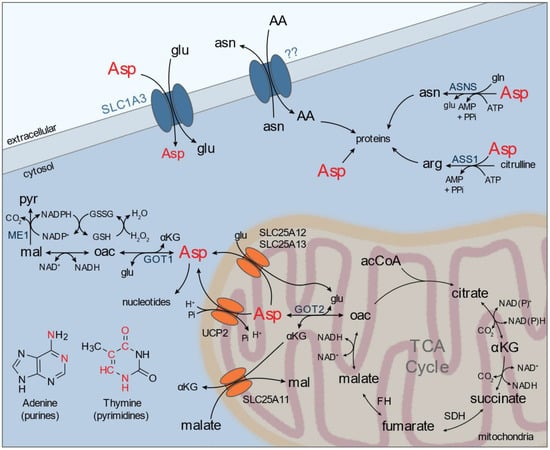 Aspartate is an acidic non-essential amino acid that can be acquired by either de novo synthesis and/or import from external sources. However, circulating levels of aspartate in physiological conditions are low (~10 µM) and maintained by liver aspartate transaminases; thus, synthesis likely provides the majority of cellular aspartate in most contexts []. Biosynthesis of aspartate is carried out via aspartate aminotransferases (glutamic-oxaloacetic transaminases) in the cytosol (GOT1) and in the mitochondrial matrix (GOT2), which as discussed above utilize glutamate as the amino-nitrogen source. Aspartate has many biosynthetic fates within the cell (e.g., proteins, nucleotides, and amino acids) and also serves as an exchange factor for the aspartate-glutamate carrier (AGC1/AGC2), an essential component of the malate-aspartate-shuttle (MAS) (Figure 2). MAS is responsible for transferring electrons from cytosolic NADH to mitochondrial NADH, as reducing equivalents (e.g., NAD(P)H) cannot directly cross the inner mitochondrial membrane. However, recent studies identified that SLC25A51 and SLC25A52 facilitate mitochondrial NAD+ transport [,,]. Subsequent activity of the MAS and/or UCP2 is required to export aspartate into the cytosol where it can be used as a proteinogenic source and/or a precursor for arginine and asparagine synthesis [,].
