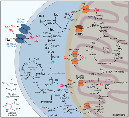 Despite the important role that serine plays for nucleotide, glycine, and one-carbon metabolism and the compartmentalization of these pathways; the transporter(s) involved in its transport into the mitochondria have only recently been identified. Kory et al. identified that sideroflexin 1 (SFXN1) and other SFXN homologs act as inner mitochondrial membrane-localized serine transporters []. To identify the mitochondrial serine transporter, Kory et al. utilized a functional genetic screening approach in cells lacking the cytosolic arm of FOCM, creating an increased reliance on mitochondrial serine transport for proliferation. Functionally, SFXN1 was important for glycine pool maintenance and folate charging, owing to defective oxidative mitochondrial serine-dependent FOCM activity. SFXN1-null cells were not auxotrophic for glycine, suggesting that other sideroflexin homologs, of which there are five, may relay some compensatory activity. Through subsequent functional genetic screening in SFXN1-null cells, the authors found that SFXN3 was a likely candidate for redundant mitochondrial serine transport. In vitro liposome reconstitution of SFXN1 and stable isotope tracing suggest that SFXN1 is capable of importing serine and other small neutral amino acids, including alanine, cysteine, and glycine. This study fills an important gap in our knowledge of mitochondrial serine transport and highlights the power of functional genetic screening, stable-isotope tracing, and metabolomics to characterize transporter function in relevant contexts. Given the redundant function of some sideroflexin homologs, complete suppression of mitochondrial transport may require inhibition of multiple targets to treatment of aberrant serine metabolism in diseases like cancer. Mitochondrial glycine import and/or export may also play an important role in facilitative FOCM and purine and glutathione biosynthesis. SLC25A38, and its yeast homolog Hem25, was recently characterized as a mitochondrial glycine transporter []. Mutations in SLC25A38 give rise to congenital sideroblastic anemia, caused by a defect in heme biosynthesis []. Notably, SHMT2 activity could, in theory, provide mitochondrial glycine for heme biosynthesis; however, the authors found that Shm1 and Shm2 (yeast homologs of SHMT1 and SHMT2, respectively) did not significantly contribute to heme synthesis []. Notably, it is not clear whether SLC25A38 also facilitates mitochondrial glycine export, which may be important for purine and glutathione synthesis in nutrient-limited environments.