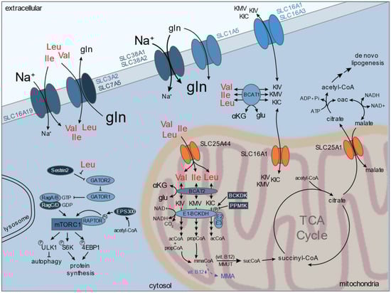Biochemical pathways and sensing mechanisms involving the branched-chain amino acids (BCAAs) leucine (Leu), isoleucine (Ile), and valine (Val). BCAAs are mainly imported by the large amino acid transporter (LAT1), a dimer consisting of SLC7A5 and SLC3A2/CD98, which functions as an amino acid exchanger and the Na+-dependent SLC16A9/B0AT1. Glutamine—mainly transported by SLC38A1, SLC38A2, and SLC1A5—is thought to provide the chemical driving force necessary to influx BCAAs through LAT1. Cytosolic leucine is directly sensed by Sestrin2 and regulates mTORC1-dependent signals that control autophagy, protein synthesis, and proliferation. BCAAs can be metabolized by the BCAA transaminase (BCAT) present in the cytosol (BCAT1) or mitochondrial (BCAT2), which produce branched-chain ketoacids (BCKAs). Cytosolic BCKAs can be transported through SLC16A monocarboxylate transporters present on the plasma membrane or mitochondria. BCAAs are imported into the mitochondria by SLC25A44 and can contribute to acyl-CoA production through activity of BCAT2 and BCKA dehydrogenase (BCKDH), which is regulated by BCKDH kinase (BCKDK) and Mg2+/Mn2+-dependent 1K protein phosphatase (PPM1K). Acyl-CoA produced by BCAA catabolism can fuel TCA cycle metabolism and de novo lipogenesis. Acetyl-CoA levels are sensed through EPS300-dependent acetylation of RAPTOR, which in-turn regulates mTORC1 activity. Mitochondrial propionyl-CoA, produced either from valine or isoleucine catabolism, is metabolized to produce succinyl-CoA, but can produce the byproduct methylmalonate (MMA) when vitamin B12 levels are low. AcCoA, acetyl-coenzyme A; αKG, α-ketoglutarate; Gln, glutamine; Glu, glutamate; Ile, isoleucine; KIC, α-ketoisocaproic acid; KIV, α-ketoisovaleric; KMV, α-keto-β-methylvaleric; Leu, leucine; Oac, oxaloacetate; PropCoA, propionyl-coenzyme A; SucCoA, succinyl-coenzyme A; Val, valine.