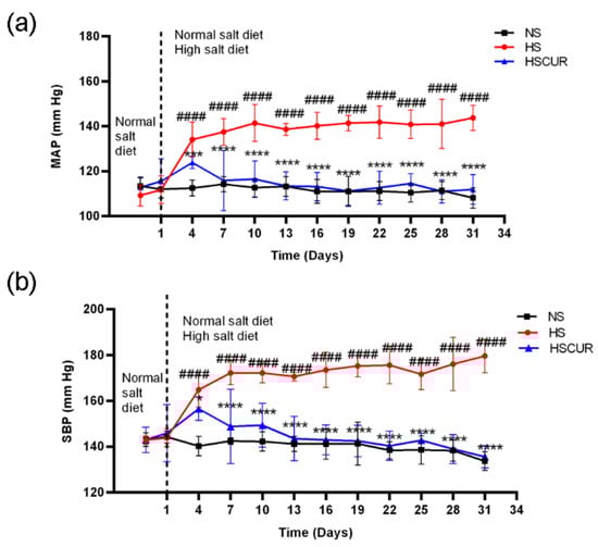 Curcumin reverted the high-salt diet (HSD)-induced increase in blood pressure. Changes in mean arterial pressure (a), and systolic blood pressure (b) among normal salt (NS), high salt (HS), and HS diet with curcumin (HSCUR) rats. Note: data are shown as the mean ± SD (n = 7 per group), #### p < 0.0001 denotes the significant levels of difference between the NS and HS groups; **** p < 0.0001, *** p < 0.001, and * p < 0.05 denote the significant levels of difference between the HS and HSCUR groups.