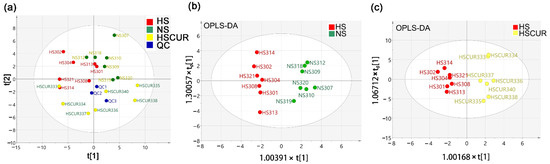 Hepatic metabolomics analysis. Score plot of principal component analysis (PCA) (a) and orthogonal partial least squares discriminant analysis (OPLS-DA) between NS and HS (b), or HS and HSCUR groups (c).