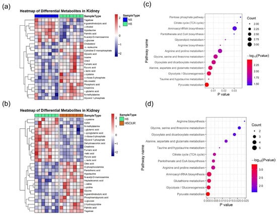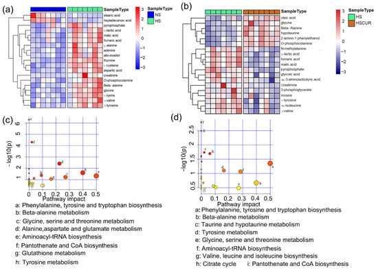 Hepatic metabolomics analysis. Differential metabolites in liver tissues between the HS and NS groups (a), or the HS and HSCUR groups (b); metabolic pathway enrichment analysis based on differential metabolites between the NS and HS groups (c), or the HS and HSCUR groups (d). The difference in the Mann–Whitney–Wilcoxon test with the false discovery rate (FDR) using Benjamini–Hochberg (BH) method adjusted p-value less than 0.05 was considered significant. Colors in sub-figures (c,d) were determined by –log10 (p) values, pathways with higher –log10 (p) were shown in red, and vice were shown in yellow.