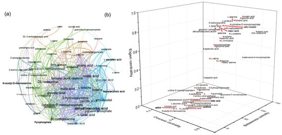 Hepatic metabolomics analysis. Metabolic correlation network analysis (a), and three-dimensional scatter plot of centrality indices of the correlation network (b). Pearson’s correlation coefficient (r) was used to construct the metabolic correlation network (using Gephi-0.9.2), and the threshold of the absolute correlation coefficient was set as no less than 0.5 at p-value less than 0.05.