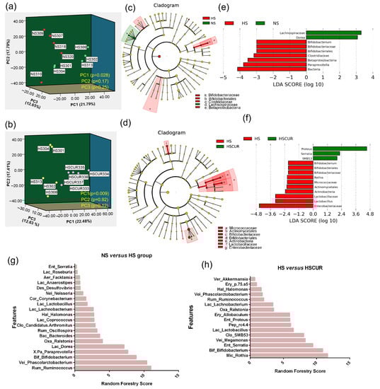 HSD feeding and curcumin administration changed the gut microbial composition in SS rats. Score plot of PCA analysis based on weighted UniFrac distance between the NS and HS groups (a), or the HS and HSCUR groups (b); the cladogram of linear discriminant analysis (LDA) effect size (LEfSe) analysis between the NS (green) and HS (red) groups (c), and LDA scores of differential microbial communities between the NS and HS groups (d); the cladogram of the LEfSe analysis between the HS (red) and HSCUR (green) groups (e), and the LDA scores of differential microbial communities between the HS and HSCUR groups (f); importance level of microbial communities for the classification between the HS and NS groups (g), or HSCUR (h) groups based on random forestry models.