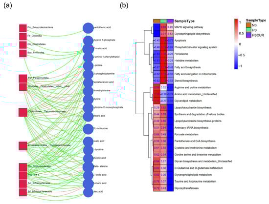 The integrated analysis of hepatic metabolomics and gut microbiota provided a comprehensive understanding of the metabolic regulatory mechanism in the liver-gut axis. In this study, integration analysis was employed to identify key features of hepatic metabolites or microbial communities that are closely related to each other. In the integrated correlation network, the node size was set according to the degree of key features in the correlation network; red edges denoted positive relationships, and green edges represented the negative relationship between metabolites and microbial communities. The results demonstrated that Par_Paraprevotella, Clo_Clostridiales_other_other, Clo_Dehalobacteriaceae, Clo_Peptococcaceae, Pep_rc4-4, and Ery_Erysipelotrichaceae were prominent nodes in the network, which were closely related to hepatic metabolites, including beta-alanine, l-lactic acid, malic acid, fumaric acid, l-tyrosine, and o-phosphocalamine (Figure 6a). Beta-alanine, fumaric acid, malic acid, and l-lactic acid, which were upregulated in HS rats, were also prominent nodes in this network (Figure 6a). It seemed that Clostridiales and Erysipelotrichaceae played a dominant role in the perturbation of hepatic metabolism. PICRUSt was employed to predict the microbial function based on 16S rRNA sequencing data. PICRUSt analysis revealed 104 function pathways in level 3 with significant differences between NS, HS, and HSCUR rats (Table S1, Kruskal–Wallis raw p-value less than 0.05, FDR adjusted p-value less than 0.1). Notably, 25 pathways associated with metabolism, signaling, and REDOX balance are shown in Figure 6b. MAPK signaling pathway, glycosphingolipid biosynthesis, apoptosis, phosphatidylinositol signaling system, peroxisome, histidine metabolism, fatty acid biosynthesis, fatty acid elongation in mitochondria, steroid biosynthesis, lipopolysaccharide (LPS) biosynthesis, LPS biosynthesis proteins, synthesis and degradation of ketone bodies, and aminoacyl tRNA biosynthesis were significantly enriched in the HS group compared to NS group. However, amino acid metabolism pathways including arginine and proline metabolism, cysteine and methionine metabolism, d-glutamine and d-glutamate metabolism, glycine, serine, and threonine metabolism, and taurine and hypotaurine metabolism were markedly reduced in the HS group when compared to the NS group (Figure 6b). Curcumin intervention significantly inhibited the salt-induced enrichment in apoptosis, peroxisome, LPS biosynthesis, LPS biosynthesis proteins, and lipid biosynthesis (steroid biosynthesis and fatty acid biosynthesis) in gut microbes. Unexpectedly, the decrease in amino acids metabolism induced by HSD was not reversed by curcumin intervention; in contrast, curcumin significantly reduced microbial amino acids metabolism further (Figure 6b). This may be related to the decrease in the abundance of some microbial species caused by curcumin supplementation, which are shown in Figure 5f.