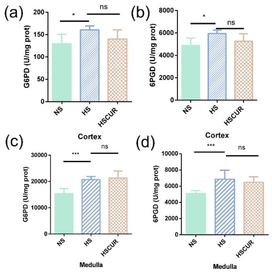 HSD induced a significant increase in glucose-6-phosphate dehydrogenase (G6PD) and 6-phosphogluconate dehydrogenase (6PGD) in the renal tissues. The activity of G6PD in the renal cortex (a) and medulla (c); the activity of 6PGD in the renal cortex (b) and medulla (d). ns denotes non significance, *** p < 0.001, * p < 0.05, and p-value was determined by one-way ANOVA test followed by Tukey’s test.