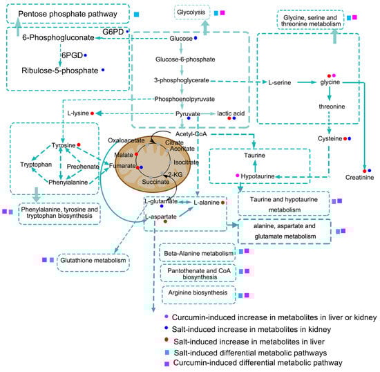 Collectively, metabolic changes in the liver and kidney after HSD and curcumin treatment were shown in Figure 9. Metabolic perturbations appeared to be closely related to the intermediate metabolites of glycolysis, which implies that HSD feeding might inhibit carbohydrate metabolism through the citrate cycle, and discontinuous flux in the citrate cycle promotes the enhancement of PPP and glycolysis. Subsequently, excessive amino acids and organic acids are derived from the intermediate metabolites of glycolysis, such as pyruvate, l-lactic acid, l-lysine, and l-alanine. Moreover, the increase in the levels of ribulose-5-phosphate, and the enzyme activities of G6PD and 6PGD suggest the activation of PPP in the kidney and further validates the above inference. In addition, amino acid metabolism pathways associated with glycolysis, including glycine, serine and threonine metabolism, phenylalanine, tyrosine and tryptophan biosynthesis, glutathione metabolism, taurine and hypotaurine metabolism, alanine, aspartate and glutamate metabolism, beta-alanine metabolism, and arginine biosynthesis, were disturbed by HSD. Incidentally, curcumin intervention also caused changes in those metabolic pathways. The therapeutic effect of curcumin was that it could reduce salt-induced abundance in pyruvate, l-lactic acid, alanine, fumaric acid, and creatinine, etc., in livers or in kidneys. In combination with the changes in microbial functions based on 16S rRNA sequencing data, we hypothesized that salt-induced changes in microbial composition promoted LPS synthesis, peroxisomes, and apoptosis, and these microbial-associated changes might further implicate in the regulation of host oxidative stress and metabolism.