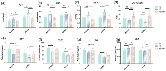 Metabolic disorders are commonly followed by mitochondrial antioxidant dysfunction and over expression of reactive oxygen species (ROS) [,]. Therefore, the renal levels of H2O2 and MDA were assessed. HSD feeding promoted a significant increase in renal H2O2 (p < 0.01), whereas curcumin intervention effectively inhibited the increase in H2O2 content in renal medulla (p < 0.05) and cortex (p < 0.0001) (Figure 10a). Moreover, the changing trend of MDA resembled that of H2O2 in the kidneys, while the difference was insignificant in the HS group compared to the NS group; however, curcumin intervention induced a significant reduction in MDA (p < 0.05, Figure 10b). A previous study reported that two GSH molecules donate one electron to GSSG under oxidative stress, which can be reduced back to GSH by the catalysis of GR []. Thus, the GSH/GSSG ratio, an indicator of the redox balance, was measured in this study. An increase in GSSG content was observed in the renal medulla (p > 0.05) and cortex (p < 0.01, Figure 10c), whereas curcumin inhibited the increase in GSSG in the renal medulla (p < 0.05) and cortex (p < 0.001, Figure 10c). The ratio of GSH/GSSG in the renal medulla and cortex was slightly reduced after HSD feeding (p > 0.05); however, curcumin intervention promoted a significant increase in the cortex (p < 0.01, Figure 10d).