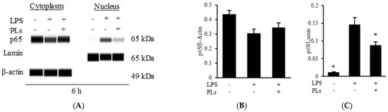 Western blotting was performed to elucidate the effects of PLs on the nuclear factor kappa B (NF-κB) pathway in LPS-induced inflammation. THP-1–derived macrophages treated with PLs showed markedly suppressed nuclear p65 levels but high cytoplasmic p65 levels (Figure 5A–C). Lamin, a nuclear marker, was detected only in the nuclear fraction (Figure 5A). At 6 h after the onset of treatment, cytoplasmic p65 signals were detected at similar levels in all treatment groups, whereas nuclear p65 signals were strong in the LPS-treated group but relatively weak in the LPS + PL-treated group.