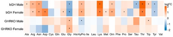 Plasma Amino Acid Levels. The plasma from 7-month-old bGH and GHRKO males and controls were used for amino acid measurements. Data are shown as the log2 fold change in each group compared to its respective control group, with red indicating an increased plasma concentration and blue indicating a decrease compared to wild type. * Indicates t-test p < 0.05 comparing each experimental group to sex-matched WT.