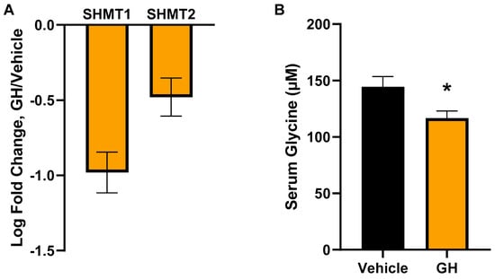 Because bGH and GHRKO mice have life-long (chronic) GH alterations, it is difficult to determine whether the glycine changes in these mice are directly linked to GH or just correlated. To address this, the response of glycine metabolism to an acute GH treatment was assessed by injecting recombinant human GH into mice that do not express pituitary GH (GHKO). Liver expression of two major glycine synthesis genes, SHMT1 and SHMT2, was significantly decreased (q = 9.08 × 10−14 and q = 1.34 × 10−7, respectively) following five daily injections of human GH (Figure 3A). When serum levels of glycine were assessed in these mice, there was also a significant decrease in serum glycine in GH-treated mice compared to controls after only five days of GH treatment.