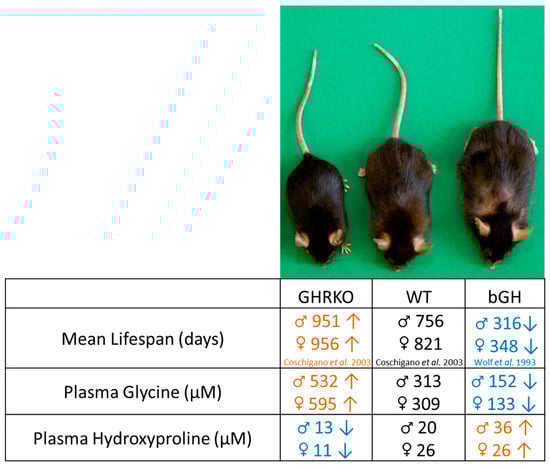 Increased glycine intake has been shown to extend lifespan in both male and female mice [], possibly due to an anti-inflammatory effect [], improved methionine clearance, or a reduction in certain types of cancer []. Furthermore, obesity-related diseases, such as type 2 diabetes and non-alcoholic fatty liver disease (NAFLD), are associated with lower circulating glycine levels in humans [,]. In fact, it has been shown that patients with morbid obesity have reduced glycine synthesis via SHMTs as well as increased insulin levels []. Moreover, serum glycine levels, glycine synthesis, body weight, and insulin resistance improve after bariatric surgery []. In addition, hydroxyproline and collagen deposition has been positively associated with the pathogenesis of several diseases. To better understand if there is an association between the lifespan seen in GHRKO and bGH mice with the plasma levels of glycine and hydroxyproline, a literature search to find papers that reported the median lifespan of male and female GHRKO and bGH mice with their respective controls was performed. We found a positive association between lifespan and plasma glycine in both bGH and GHRKO mice and a negative association between lifespan and plasma hydroxyproline in both models (Figure 4) [,]. These results suggest that the changes in lifespan associated with GH alterations may be associated with shifts in circulating amino acids seen in these mice.