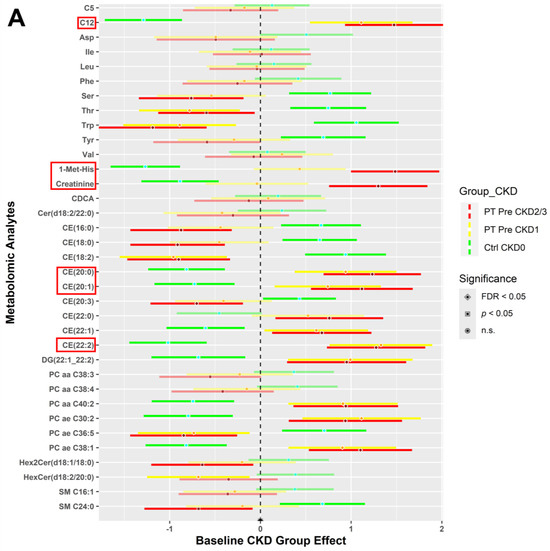 Plasma from blood samples collected for all study participants combined into one group at baseline were analyzed. Figure 2 displays the expression of metabolomic analytes (A) and metabolic indicators (B) in forest plots by CKD group effect. Data for both plots were separated by CKD stages (0, 1, and 2/3) to distinctively model varying expression levels of metabolites and indicators pre-intervention. The forest plot also highlights the levels of expression of other metabolites and indicators by CKD stages for comparison; however, they are not statistically significant (lightly shaded bars with circles). Significant metabolites and indicators (dark shaded colored bars) of interest are highlighted with a red box.