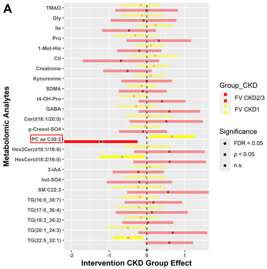 Furthermore, forest plots illustrating the changes in metabolite (A) and indicator (B) expression levels between baseline and post-intervention for participants randomized to the FV group are shown in Figure 4. Intervention participants displayed fewer significant metabolites compared to the WL participants in Figure 3. In the comparison of pre- and post-intervention, the FV group portrayed lower expression levels of phosphatidylcholine—PC aa C30:2 (p < 0.05) in participants with CKD2/3 (Figure 4A). Additionally, Figure 4B shows that the indicator for long-chain 3-hydroxyacyl-coenzyme A dehydrogenase (LCHAD) deficiency (NBS) was higher in FV participants with CKD2/3 (p < 0.05). As mentioned before, the lightly shaded bars with circles indicate nonsignificant levels of expression. Significant metabolites and indicators (dark shaded colored bars) of interest are highlighted with a red box.