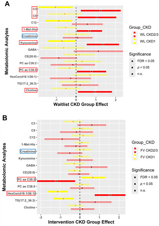 A comparison of 6 weeks post-intervention and baseline results showed changes in metabolite and indicator expression levels (post- minus pre-intervention) for the WL (Figure 3) and FV (Figure 4) groups separately. Forest plots representing the changes in metabolite (A) and indicator (B) expression levels between baseline and post-intervention for participants randomized to the WL group are shown in Figure 3. The WL-CKD2/3 group demonstrated higher expression of metabolites 1-Met-His, hexosylceramide—HexCer (d18:2/22:0), and choline, but lower levels of diglyceride—DG (21:0_22:6) and phosphatidylcholine—PC aa C38:1 than the WL-CKD1 group (p < 0.05) (Figure 3A). In addition, the WL-CKD2/3 group demonstrated higher levels (p < 0.05) of the DLD (NBS) indicator (Figure 3B). Significant metabolites and indicators (dark shaded colored bars) of interest are highlighted with a red box.