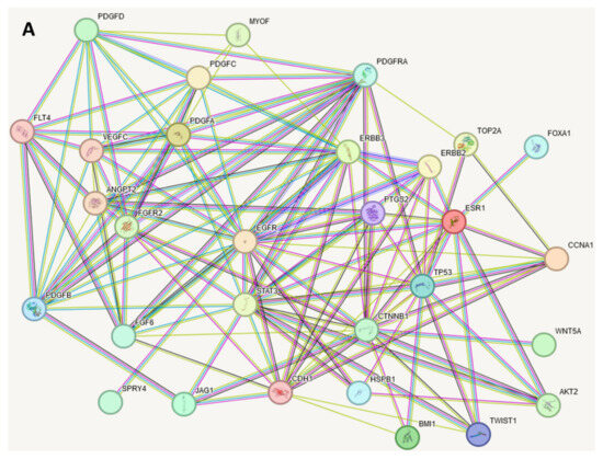 Significant genes in FMC shown in Table 2 [7,8] and corresponding proteins were analyzed with the STRINGdb program, and their relationships were elucidated (Figure 2A). There were no specific criteria applied to these genes besides their discovery as significant to feline mammary carcinoma through the studies cited.