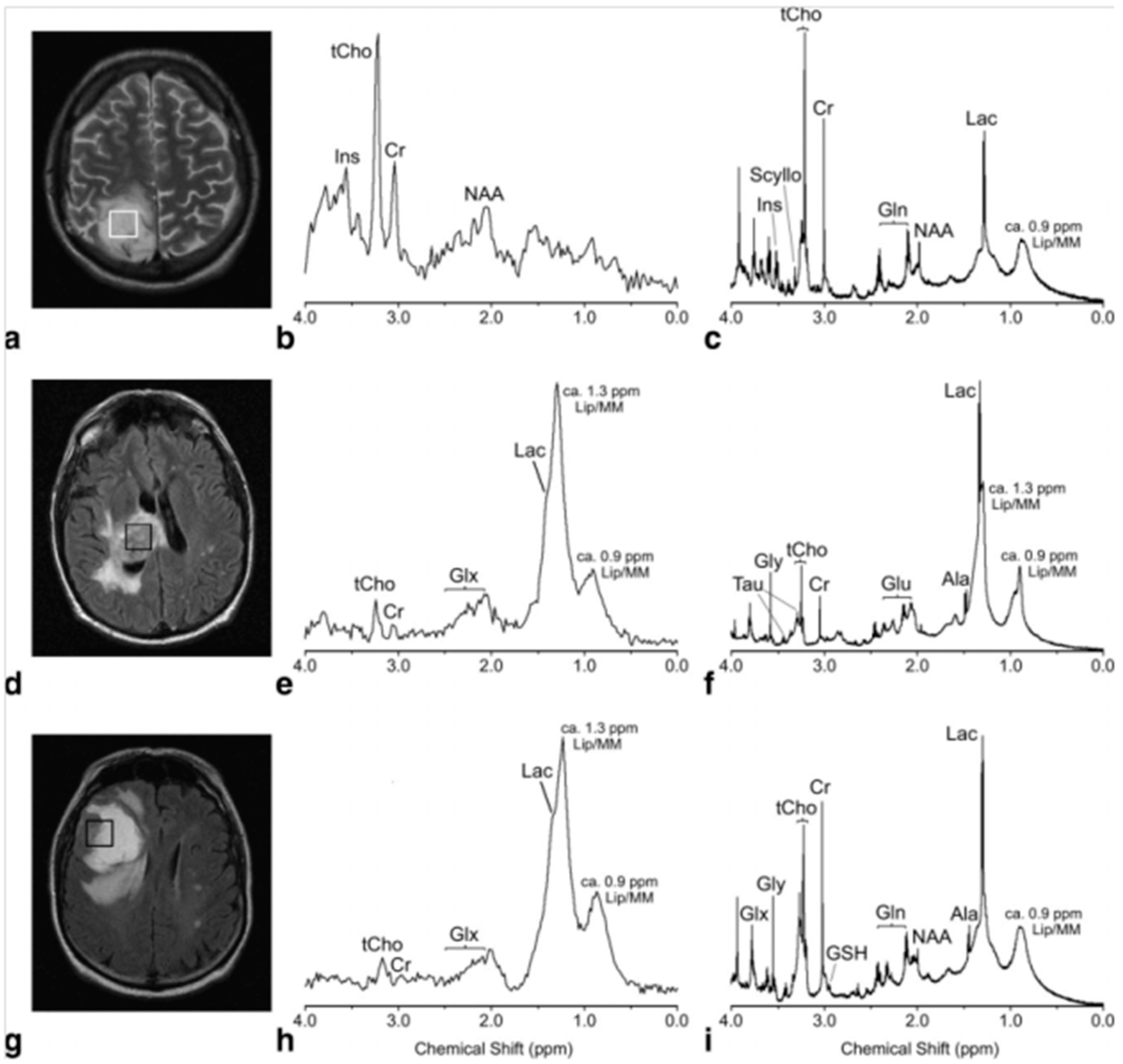 | Brain | [14] | Astrocytoma, grade II: glyerophosphocholine (GPC)↑, myo-Inositol (m-Ino)↑ Glioblastoma Multiforme (GBM): phosphocholine (PChol)↑, glycine↑, lipids↑ |