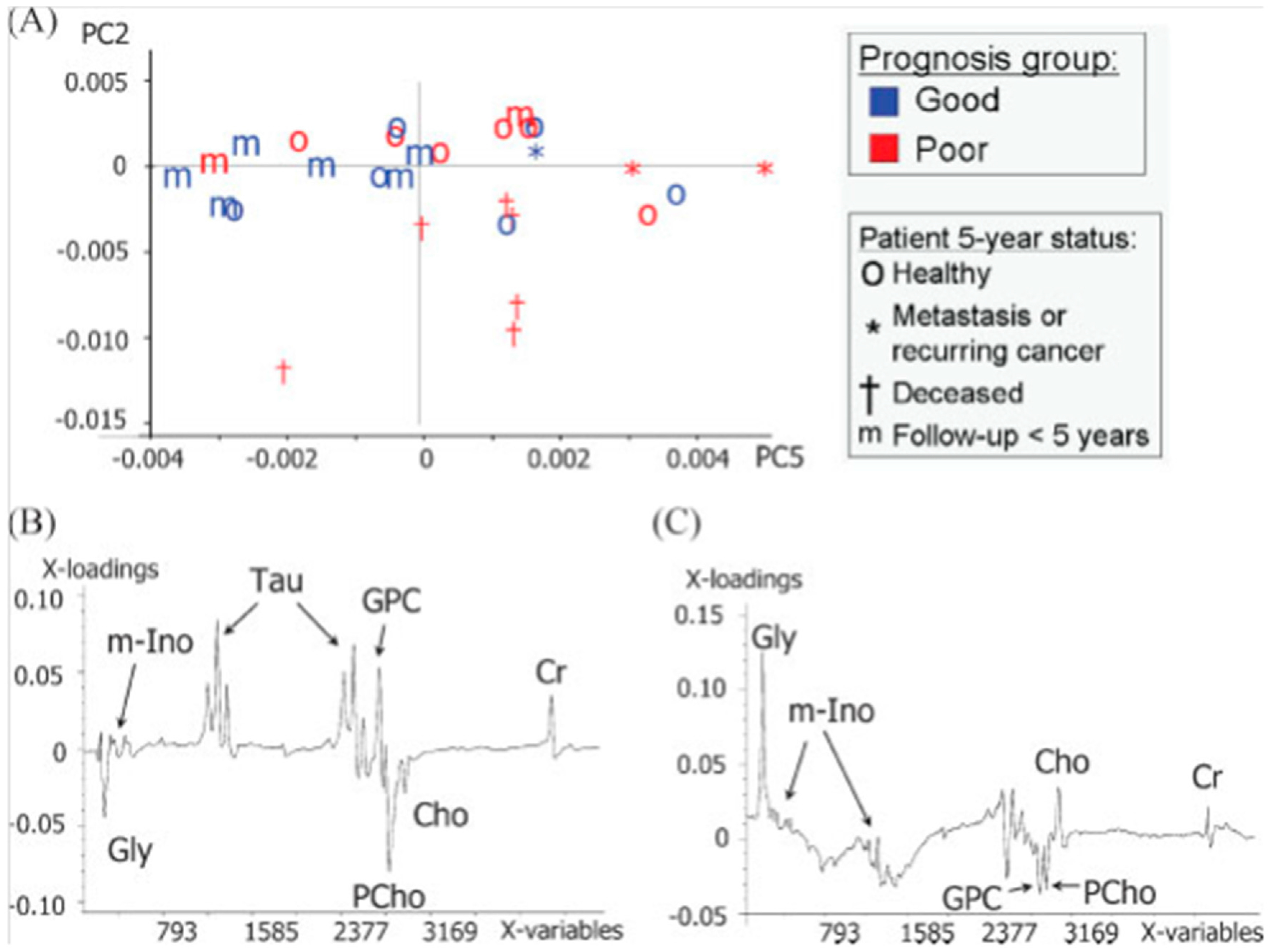 | [33] | 5-year survival: Tau↑,GPC↑, Cr↑, glycine↓, PChol↓ | |