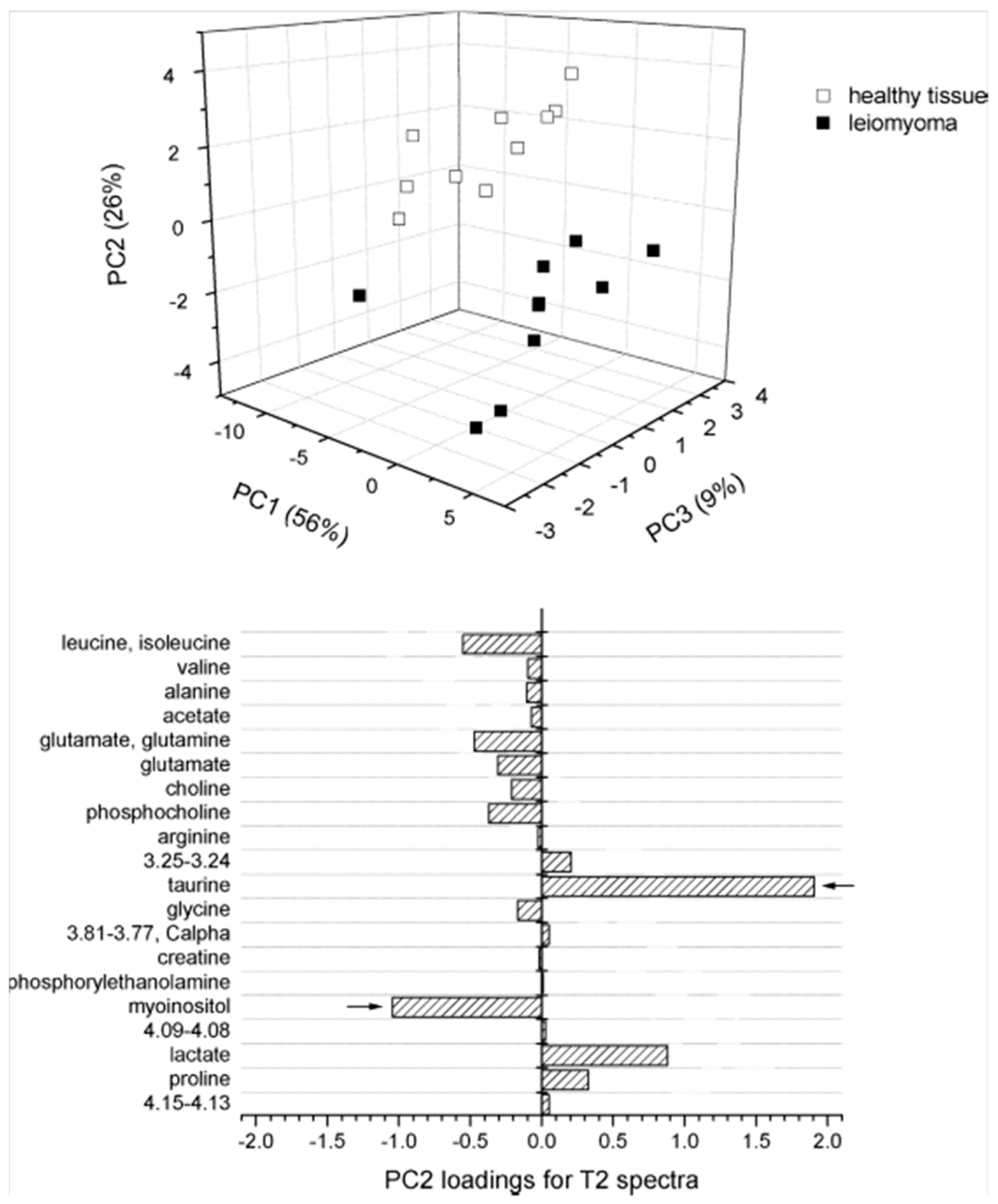 - Mazzei, P.; Piccolo, A.; Nugnes, L.; Mascolo, M.; De Rosa, G.; Staibano, S. Metabolic profile of intact tissue from uterine leiomyomas using high-resolution magic-angle-spinning (1)h nmr spectroscopy. NMR Biomed. 2010, 23, 1137–1145. [Google Scholar] [CrossRef] [PubMed]