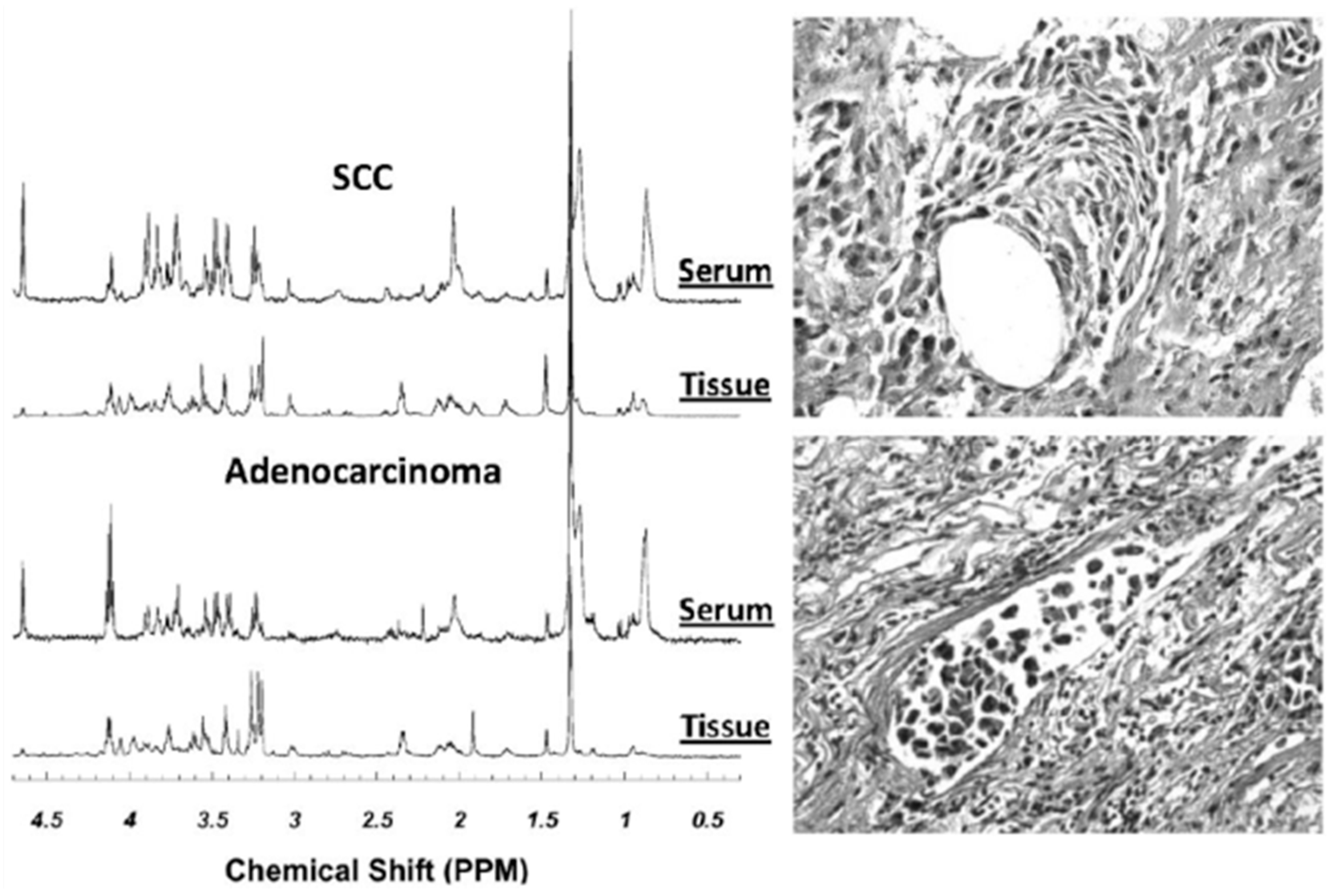 - Jordan, K.W.; Adkins, C.B.; Su, L.; Halpern, E.F.; Mark, E.J.; Christiani, D.C.; Cheng, L.L. Comparison of squamous cell carcinoma and adenocarcinoma of the lung by metabolomic analysis of tissue-serum pairs. Lung Cancer 2010, 68, 44–50. [Google Scholar] [CrossRef] [PubMed]