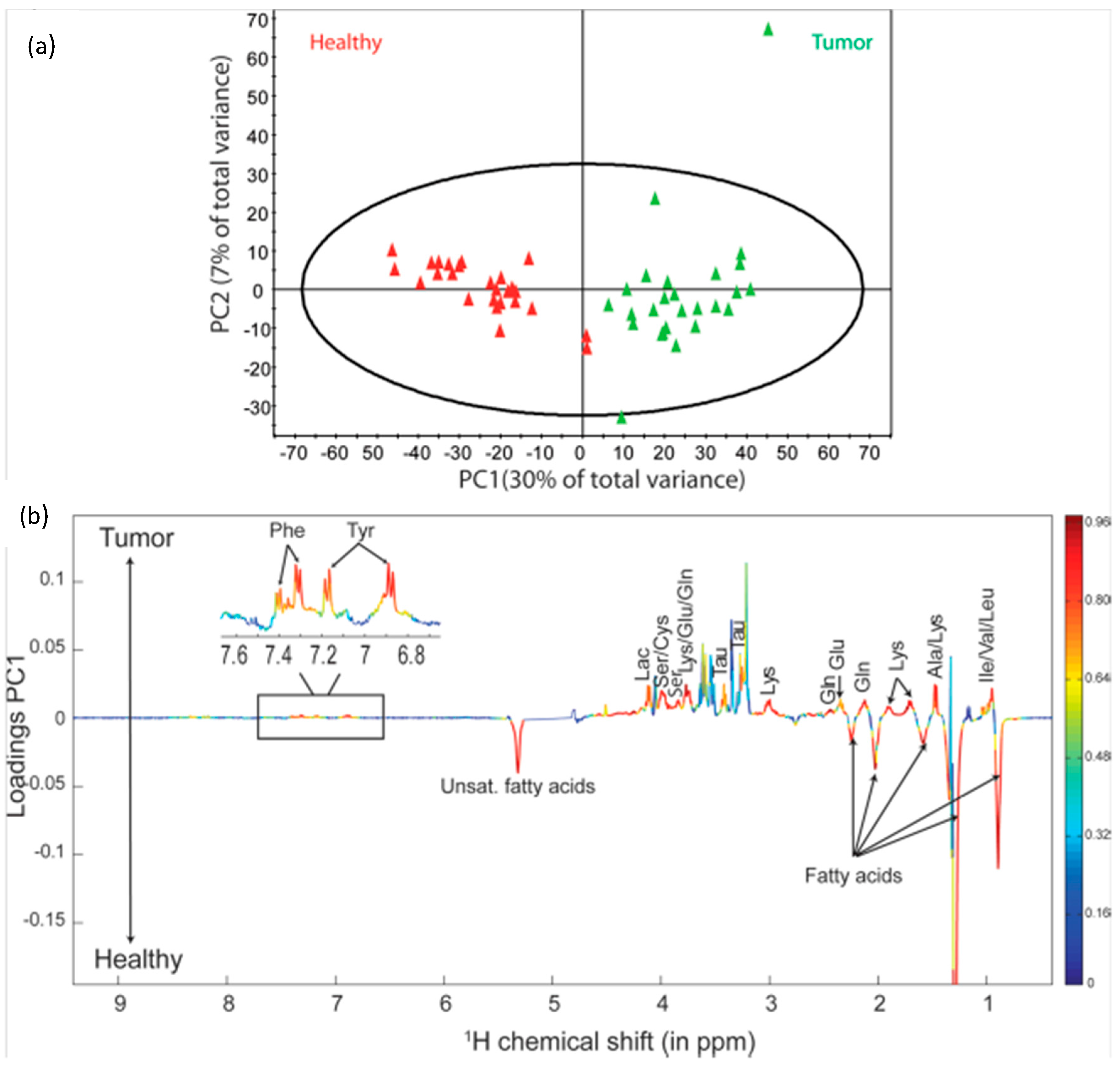 | Colorectal | [46,47] | Tau↑, isoglutamine↑, Cho↑, Lac↑, Phe↑, Tyr↑, lipids↓, triglycerides↓ |
