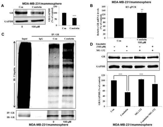 Caudatin inhibits the glucocorticoid receptor (GR) signal through the ubiquitin (Ub)-dependent degradation of GR. (A) The expression level of GR in the total protein of MDA-MB-231-derived mammospheres was measured after treatment of the mammospheres with caudatin for 48 h using western blot analyses. (B) After treatment with caudatin, the transcriptional expression of the GR gene was detected in mammospheres by real-time reverse transcription- quantitative polymerase chain reaction (RT-qPCR) using specific primers. β-actin was used as an internal control. (C) Mammospheres incubated with caudatin were lysed for immunoprecipitation (IP) with an anti-GR antibody, and western blot analysis was performed using anti-ubiquitin and anti-GR antibodies. (D) Mammospheres were incubated with caudatin and MG-132 (0.5 μM) for 24 h and lysed for western blot analysis. (E) The expression level of GR in the cytosolic and nuclear protein fractions of MDA-MB-231-derived mammospheres was measured after treatment of the mammospheres with caudatin using western blot analysis. (F) Immunofluorescence (IF) analysis of GR (green) expression and localization in MDA-MB-231 cells under caudatin treatment was performed. (G) The effect of knocking down GR expression using GR-specific siRNA on mammosphere formation was evaluated. (H) The effect of RU-486, an antagonist of GR, on mammosphere formation was evaluated. The data are presented as the mean ± SD of three independent experiments. ** p < 0.01 and *** p < 0.001 versus the DMSO-treated control group.
