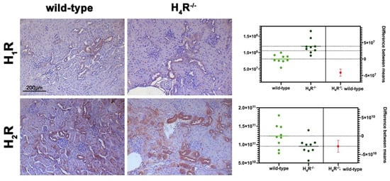 Comparison of histamine H1 and H2 receptor expression between wild-type and H4R−/− mice. Micrographs represent the immunolabeling of transverse kidney sections with specific anti-histamine H1 and H2 antibodies (20× magnification). Positive staining area/total area was determined by color deconvolution, and the estimation plot of Welch’s t-test has been reported.
