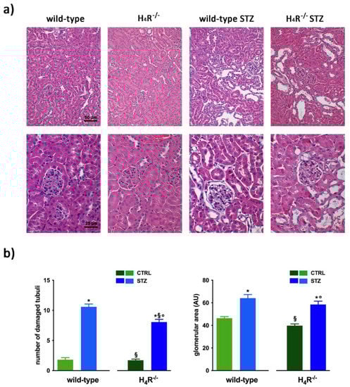 Comparison of gross tissue architecture between wild-type and H4R−/− mice: (a) Representative micrographs showing hematoxylin and eosin staining at day 116 highlighting tubular and glomerular diabetic-associated alterations magnification: 200× in upper panels and 400× in lower panels; (b) Quantification of tubular damage and glomerular area. Data are expressed as the number of damaged tubules and glomerular area (Arbitrary Unit, AU), respectively. Data are expressed as the mean ± S.E.M.; * p < 0.05 vs. wild-type; § p < 0.05 vs. STZ wild-type; ° p < 0,05 STZ H4R−/− vs. H4R−/−.