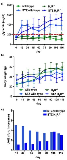 Comparison of diabetic wild-type and H4R−/− mice: (a) Six-hour fasting blood glucose was recorded fortnightly using a Glucocard MX Blood Glucose Meter. Data are expressed as mean ± S.E.M. The red line identifies the 200 mg/dL fasting blood glucose level cut used to assess the diabetes onset; (b) Body weight was monitored and recorded constantly throughout the experimental period. Data are expressed as mean ± S.E.M.; (c) Albuminuria progression was monitored over time on urine samples collected over 24 h. The data are expressed as fold increases compared to the relatively healthy controls. UAE = albuminuria.