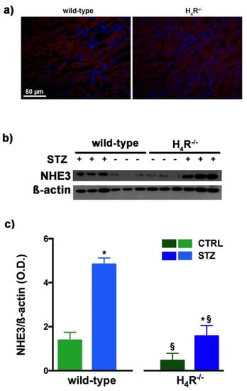 Comparison of NHE3 expression between wild-type and H4R−/− mice. Micrographs at 40× magnification showing the immunofluorescence analysis of NHE3 (red). Nuclei were stained with DAPI (blue) (a); Representative radiograph of NHE3 in kidney tissue determined by immunoblotting (b); The densitometric analysis (c) was performed, and expression levels normalized to β-actin are expressed as the mean ± S.E.M. of 3 animals/group; * p < 0.05 vs. wild-type; § p < 0.05 vs. STZ wild-type.
