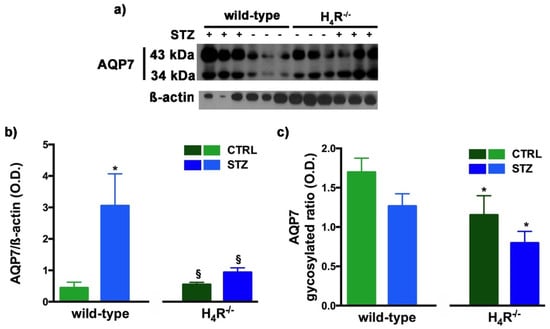 Comparison of AQP7 expression between wild-type and H4R−/− mice. Representative radiograph of AQP7 in kidney tissue determined by immunoblotting (a); The densitometric analysis of the AQP7 overall content was performed, and expression levels, normalized to β-actin, are expressed as the mean ± S.E.M. of 3 animals/group (b); The glycosylation ratio was evaluated and was expressed as the mean ± S.E.M. of 3 animals/group (c); * p < 0.05 vs. wild-type; § p < 0,05 vs. STZ wild-type.