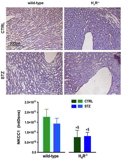 Comparison of NKCC1 expression between wild-type and H4R−/− mice. Micrographs at 20× magnification of transverse kidney sections, immunolabeled with specific anti-NKCC1 antibody. Densitometric analysis of NKCC1 expression was determined by color deconvolution analysis. Expression levels over control are expressed as the mean (IntDen) ± S.E.M. (n = 10); * p < 0.05 vs. wild-type; § p < 0.05 vs. STZ wild-type.