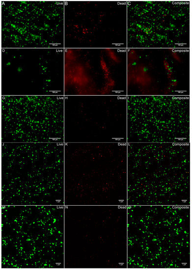 The 3D structures were half-spherical, 11.5 ± 6.9 mm in diameter (n = 3), and approximately 2.5 mm in height (Figure 3I). Phase contrast images of the 3D-printed MSCs (Figure 3A–H) were taken on the following days: 0 (day tissues were printed), day 4, day 9 and day 12, at 10 × magnification. Figure 3A–H shows that MSCs were evenly distributed throughout the construct using a layer-by-layer method and rectilinear pattern. It can also be seen that as the constructs approached day 12, the control group showed more cell death in comparison to the experimental group. These results match the 2D cell culture experiment (Figure S1).