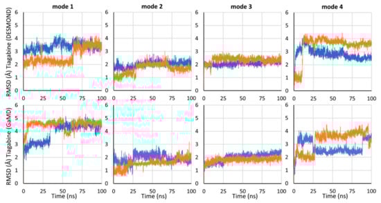 MM-GBSA binding free energy values (kcal/mol) for tiagabine in different binding modes in the course of the molecular dynamics simulations carried out with the DESMOND (MD) and NAMD (GaMD) programs. In each graph, the RMSD for MD 1 is shown in dark blue and for MD 2 it is in orange.