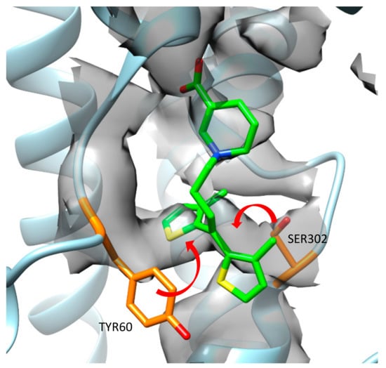 During an analysis of the published cryo-EM map and 7SK2 structure, it was observed that some amino acid residues from the model did not fit into the map very well. Moreover, they could occupy the area where one of the thiophene rings from tiagabine was placed. If side chains of Tyr60 and Ser302 were moved, they would interact with each other, creating a hydrogen bond (Figure 4). In such a case, the binding mode of tiagabine should be different, which confirms our in silico hypothesis that tiagabine interacts with GAT-1 mainly in an outward-open state.