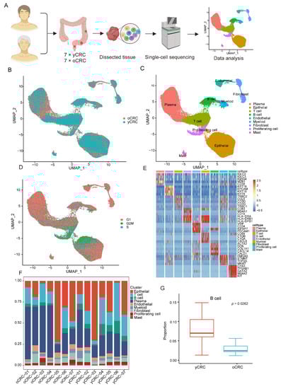 Overview of ScRNA-seq analysis of yCRC and oCRC. (A) Schematic diagram of the experimental design and workflow. (B) The UMAP plot showing the cells in yCRC and oCRC, different color represents different groups. (C) The UMAP plot showing the cell types in yCRC and oCRC, different color represents different cell types. (D) The UMAP plot showing the cells in yCRC and oCRC, different color represents different cell cycle phases. (E) Heatmap showing differential expression of marker genes in each cell type. (F) The bar chart showing the proportion of cell types in different patients. (G) Comparison of B cells proportions between yCRC and oCRC.
