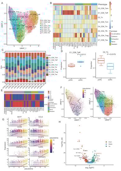 Features and heterogeneity of T cell subtypes in yCRC and oCRC. (A) UMAP plot showing the subgroups of T cells. (B) Heatmap showing expression of T cell functional phenotype genes in different T cell subtypes. (C) The bar chart showing the proportion of T cell subtypes in different patients. (D) Comparison of selected T cell subtype populations between yCRC and oCRC. (E) Heatmap showing expression of T cell functional phenotype genes in different groups. (F) Pseudotime reconstruction and developmental trajectory of CD4+T cells inferred by Monocle 3. Cells are colored by pseudotime (left). UMAP visualization of CD4+T cells (right). (G) Differential genes expression dynamics resolved along pseudotime. (H) Volcano plot showing differentially expressed genes between C6_CD4_Treg cells of yCRC and oCRC. yCRC versus oCRC, down (up) represents differential genes downregulated (upregulated) in yCRC C6_CD4_Treg.