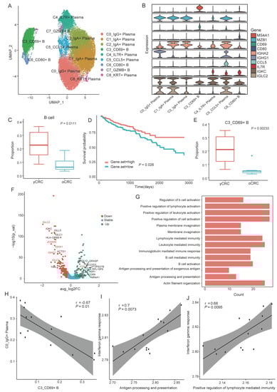 B cells and plasma cells subtypes and their heterogeneity in yCRC and oCRC. (A) UMAP plot showing the subtypes of B/plasma cells. (B) Violin plots comparing the relative expression of marker genes across various B/plasma subtypes. (C) Comparison of the B cell proportion between yCRC and oCRC. (D) The Kaplan–Meier overall survival curves of TCGA COAD and READ patients grouped by different expression levels of signature genes of plasma cells marker. Set of plasma cell marker genes: IGLC2, IGLC3, IGHG4, IGHG3, IGHA2, IGHG1, IGKC, CD138, CD38, IGHA1, JCHAIN, and IGLC1. (E) The comparisons of C3_CD69+B cells proportion between yCRC and oCRC. (F) Volcano plot showing differentially expressed genes in CD69+ B cells between yCRC and oCRC. yCRC versus oCRC, down (up) represents differential genes downregulated (upregulated) in C3_CD69+B cells from yCRC. (G) The enriched GO terms in downregulated differential genes of C3_CD69+B cells in yCRC compared with that in oCRC. (H) Correlation between abundance of C3_CD69+ B cells and C0_IgG+ plasma cells. Each dot represents one samples (n = 14). P values from spearman correlation test. (I) Correlation between C1_CD8_Teff cells interferon gamma pathway activity and C3_CD69+B cells antigen-presentation pathway activity. Each dot represents one samples (n = 14). P values from spearman correlation test. (J) Correlation between C1_CD8_Teff cells interferon gamma pathway activity and C3_CD69+B cells Positive regulation of lymphocyte-mediated immunity pathway activity. Each dot represents one samples (n = 14). P values from spearman correlation test.