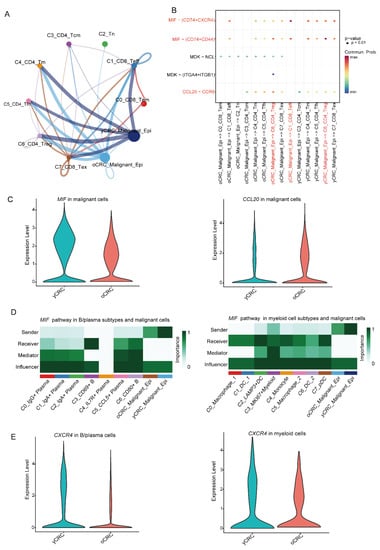 The TME is a complex ecosystem where cell-to-cell crosstalk determines the biology of the tumor and its response to treatment. To systematically characterize the interaction of cells in the TME of yCRC and oCRC, the R package CellChat was used to explore the crosstalk between malignant cells and major immune cells. We evaluated the crosstalk between T cells and malignant cells and observed that the MIF signaling pathway showed extensive intercellular communication (Figure 6A,B). We compared the expression levels of the ligand MIF in the yCRC group with those in the oCRC group and observed that MIF showed higher expression in the yCRC group (Figure 6C). The CCL20-CCR6 pathway shows the strongest communication between C6_CD4_Treg cells and oCRC_Malignant_Epi (Figure 6B), consistent with a previous suggestion that CCL20-CCR6 is associated with Treg function suppression [] Ligand CCL20 showed higher expression in the oCRC group (Figure 6C). Surprisingly, when the crosstalk between malignant cells, B cells, plasma cells, and myeloid cells was evaluated, the MIF signaling pathway also showed extensive intercellular crosstalk (Figure 6D). Similarly, CXCR4, the receptor for the MIF signaling pathway, was expressed in a much higher level in B/plasma cells and myeloid cells in the yCRC group (Figure 6E). MIF is associated with a poor prognosis, as a pro-inflammatory cytokine whose expression and secretion levels are elevated in most types of solid tumors []. MIF contributes to immune evasion and immunosuppression in the TME by regulating signals in immune cells []. Tumor-derived MIF has an inhibitory effect on the activation and proliferation of T cells. In mononuclear macrophages, tumor-derived MIF can initiate monocyte-dependent angiogenesis, suggesting an important functional role of MIF in the polarization of M2 macrophages. MIF promotes B-cell migration through the synergy of CXCR4, which may contribute to the recruitment of B cells in tumors.
