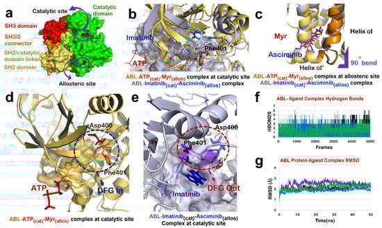 Mechanism of interaction of both Imatinib and Asciminib with ABL protein has been revealed by crystallographic studies [,]. It has been shown that the Imatinib binds to the ATP-binding site of ABL and inhibits its activity by restricting the binding of ATP and stabilizing the inactive conformation of protein, whereas Asciminib interacts at the Myr-binding site to induce the formation of αI’ helix with a 90° bend as observed in the case of binding of its natural substrate (Myr) []. We studied the effect of combination of Imatinib and Asciminib (as its allosteric inhibitor) on ABL protein structure (Figure 2a). Molecular docking and dynamic studies revealed that Imatinib binds to the ATP binding site (Figure 2b,e) and Asciminib interacts at the Myr-binding site to induce the formation of αI’ helix with a 90° bend as reported in a crystallographic study [] (Figure 2c). Imatinib induced an ‘out’ conformation of its DFG motif in the activation loop in which Asp points in an outward direction of the ATP binding site while Phe points towards it (Figure 2b,e). In the active state of ABL protein, these two residues reside in the reverse orientation thereby favoring ‘DFG-in’ conformation of this motif (Figure 2b,d). ABL-Imatinib(cat)-Asciminib(allos) complex was simulated for 50 ns, and the structure was stable over the period of simulation (Figure 2f,g). BCR-ABL fusion protein does not have a cap region, due to which Myr cannot bind to its binding site to keep ABL in an inactive state. The data implied that a combination of Imatinib and Asciminib could be considered as a therapy for targeting BCR-ABL fusion protein lacking the Myr-bound cap, as Asciminib can induce an inactive conformation of this fusion protein the way it was naturally induced by Myr-binding. Additionally, Imatinib may act as competitive inhibitor of ABL, thereby preventing the binding of ATP at its binding site and inducing an inactive conformation of its DFG motif.