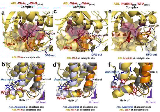 Next, the docking potential of combination of Wi-A and Wi-N on ABL protein was examined in a similar manner. Wi-A showed a good binding affinity of −75.87 ± 4.75 kCal/mol at the catalytic site of ABL, whereas Wi-N bound to the allosteric site with binding energy of −42.11 ± 10.57 kCal/mol (Table 2). The ABL-Wi-A(cat)-Wi-N(allos) complex was simulated for 50 ns and it was observed that the complex got stable within initial 10 ns of simulation (Figure 2g). Molecular interaction studies at the catalytic site of protein showed that Wi-A stably interacted at catalytic site and formed majority of interactions with Imatinib interacting residues Leu267, Gly268, Tyr272, Lys290, Phe336, Thr338, Leu389 and Phe401 (Table 2 and Supplementary File S1: Figures S1a, S1e, S2a and S2e). Also, the ionic pair between Lys290 and Glu305 was intact and the DFG-‘out’ conformation was induced by Wi-A at catalytic site of ABL protein (Figure 3a). At the allosteric site, the number of interacting residues and binding energy of Wi-N was comparatively lower than that of Asciminib (Table 2 and Supplementary File S1: Figures S1b, S1f, S2b and S2f). Wi-N did not show interaction with Asciminib interacting residues like Ala356, Ala452 and Glu481 (Supplementary File S1: Figure S2b,f). However, Wi-N interacted with allosteric site residues like Glu353, Val357 and Asn355. Interestingly, Wi-N was able to induce the conformational change at the allosteric site similar to the one induced by Asciminib and Myr (Figure 3b). Therefore, it was concluded that the combination of Wi-A and Wi-N might mimic the binding mechanism of Imatinib and Asciminib, respectively.