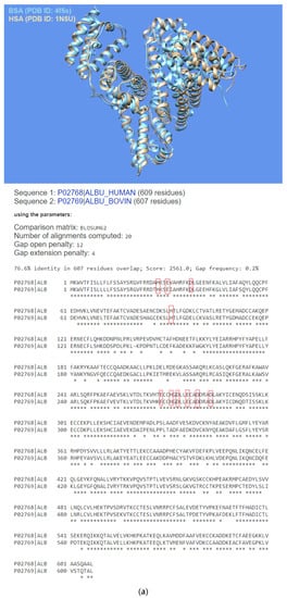Among the several families of proteins, albumins [,,] are characterized by high peptide sequence homology, with human and bovine albumins sharing more than 75% identity []. Abundantly present in the circulatory system, albumins help maintain the osmotic blood pressure between the tissues and blood vessels []. Albumins, particularly bovine serum albumin (BSA), are often employed as protein models [,,], and their interaction with most diverse ligands has been investigated for various applications in biomedicine and industrial areas [,,,,,,,]. The crystal structures of human serum albumin (HSA) and BSA, which share ~80% identity [] and ~90% homology similarity [] in the amino acid sequence, are shown superimposed in Figure 1a together with the sequence alignments. The albumin structure shows three domains with two main high-affinity binding sites alongside several others to which ligands bind with lower affinity [].