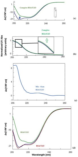 Notoriously, the BSA structure is dominated by α-helix structures, which account for approximately 60% of its structure []. Moreover, about 20% of β-sheet + β-turn structures as well as ca. 20% random coil were experimentally observed for the native BSA in solution [,]. Accordingly, our far-UV CD experiments revealed for the unliganded serum albumin, mainly the characteristic features of the typical helical structure of proteins, i.e., two negative bands at about 208 and 222 nm (Figure 2a, blue line). After complexation with U2O, the CD band at 208 nm underwent bathochromic and hypochromic shifts (Figure 2a, green line). This evidence, together with the slight hyperchromic effect observed in the UV spectrum of the complex (Figure 2b, green line) relative to the curve of the unliganded BSA (blue line), and the non-null difference CD spectrum (Figure 2c), indicated that the BSA secondary structure underwent slight but clear modifications as a consequence of the interaction with U2O but not T2O (Figure 2d). In fact, when the CD binding experiment was performed with T2O, no substantial CD spectral difference was observed, suggesting that T2O was not able to provoke significant secondary structure perturbation in the albumin target. To achieve more quantitative information on the interaction of U2O with the protein, we performed a deconvolution of the CD spectra and reported the rates for the secondary structures’ content in the BSA and their variations in the absence and presence of an excess of U2O in Table 1.