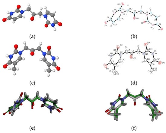 The energy-minimized 3D structure models of U2O (a) and T2O (c) obtained by MolView software (TU Delft, Deft, Netherlands, v2.4) compared to the X-ray solved structures (b,d, respectively). Superimposed U2O (e) and T2O (f) 3D computational models (green) and their X-ray solved structures. The original files for the two X-ray structures can be freely downloaded from https://www.ccdc.cam.ac.uk/ (accessed on 14 July 2022) CCDC 932,679 (U2O) and 821,514 (T2O) [,].