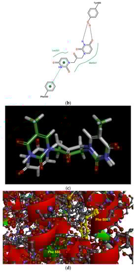 The HDOCK scores listed in Table 2 are dimensionless and are helpful only in achieving comparisons between ligands of the same target. Therefore, we also used the same procedure with T2O, which showed a lower affinity for the same protein as revealed by the HDOCK scores and AutoDock Vina binding energies (Table 2). Similarly, we also repeated the blind docking with the reference literature BSA ligand HA 14−1 []. Our docking seems to indicate that U2O could bind BSA with higher affinity than HA 14−1, as suggested by the larger negative scores for U2O observed for the top-1, top 1–3, and top 1–10 poses (−158.56 vs. −137.72, −157.11 ± 1.38 vs. −129.80 ± 6.92, −155.18 ± 1.60 vs. −124.72 ± 5.15, respectively, Table 2). Accordingly, the binding energy was more favorable in the case of U2O with respect to T2O and HA 14−1 (−7.6 vs. −7.0 and −5.9 kcal/mol, respectively). Moreover, the amino acid residues involved in the three predicted interactions are different, suggesting that while HA 14−1 binds the chain B of BSA at the subdomain IIA (Figure 4a) as reported in the literature [], T2O and U2O more likely recognize the albumin (Figure 4a) at the level of chain A, with T2O binding the subdomain IIIA while U2O interacts with Tyr-400 (with predicted H-bonding, C=O—H-O H-bond length: 2.44 Å) and residues such as Phe-550 (π-stacking), Leu-531 and Met-547 (hydrophobic interaction, Figure 4b) of the subdomain IIIB. The differences in BSA binding observed experimentally could be due to the higher steric hindrance determined by the two methyl groups in T2O as well as the different orientation of the carbonyl and NH moieties in this latter compound with respect to U2O (Figure 4c), not allowing the simultaneous H-bond, hydrophobic and aromatic interactions stabilizing the BSA/U2O complex. Our studies suggest that U2O interacts with the protein backbone via hydrogen bonding, and interactions with hydrophobic residues interfere with the mutual attraction of BSA nonpolar groups, as well as π–π stacking interactions leading to the observed UV absorbance differences (e.g., interference with π–π Phe 550–Phe 508 stacking, Figure 4d).
