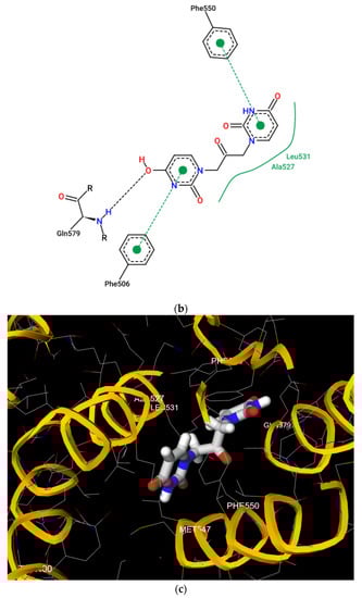 Flexible docking was also performed on U2O in complex with BSA using the program FireDock []. This study confirmed the tendency of U2O to bind the albumin in the subdomain IIIB (Figure 5a) involving again Phe-550 in aromatic interactions and Leu-531 (hydrophobic interaction) together with Phe-506 (aromatic interaction), Gln 579 (H-bonding), and Ala-527 (hydrophobic interaction, Figure 5b). Overall, all BSA residues involved in the interaction with U2O predicted after both the rigid and flexible dockings belong to α-helical regions (Figure 5c) of the albumin, suggesting that this molecular recognition can alter the α-helical content of BSA. Finally, in predicting some pharmacokinetics for U2O, we found that the compound, not likely to permeate the blood–brain barrier (BBB, Table 3), is slightly more soluble in water than in organic solvents (cLogP = −0.83, Table 3). Nonetheless, it shows a favorable drug-likeness profile (0 violations of Lipinski’s rule of five, Table 3) []. In this prediction, U2O lacks any unspecific biomolecular interaction tendency (PAINS score: 0, Table 3) []. On the other side, T2O shows similar predicted pharmacokinetic properties but is endowed with higher hydrophobicity (cLogP = −0.15, Table 3) because of the two methyl moieties of thymine bases.